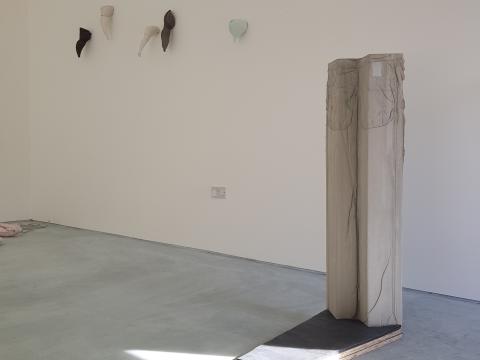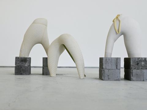 Top to Bottom; 'Mama Sunshine', 2021, cotton skirt, fibreglass reinforced jesmonite, steel fixings, 77 x 14 x 177 cm; 'Stack', 2018, jesmonite, 53 x 38 x 28 cm