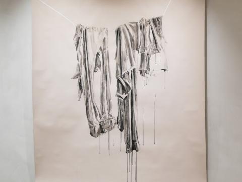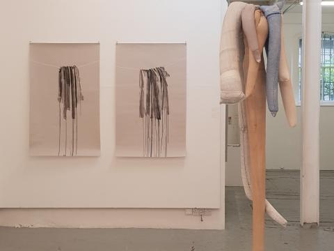 Left to Right; 'Big Washing Diptych’, 2024, paint, ink and chalk on paper, 140 x 88 cm; ‘Drip', 2024, polymer plaster, washing line cord, steel, 110 x 31 x 27 cm, plus cord extended to ceiling.