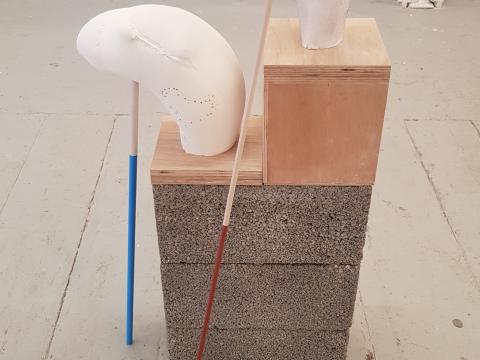 'Pink Heart / Blue Johanna', 2024, polymer plaster, concrete blocks, wood, painted steel poles, 137.5 x 78 x 72 cm