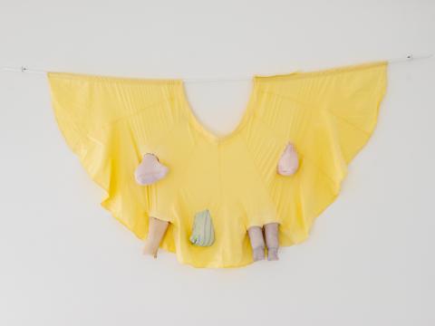 'Mama Sunshine', 2021, cotton skirt, fibreglass reinforced jesmonite, steel fixings, 77 x 14 x 177 cm